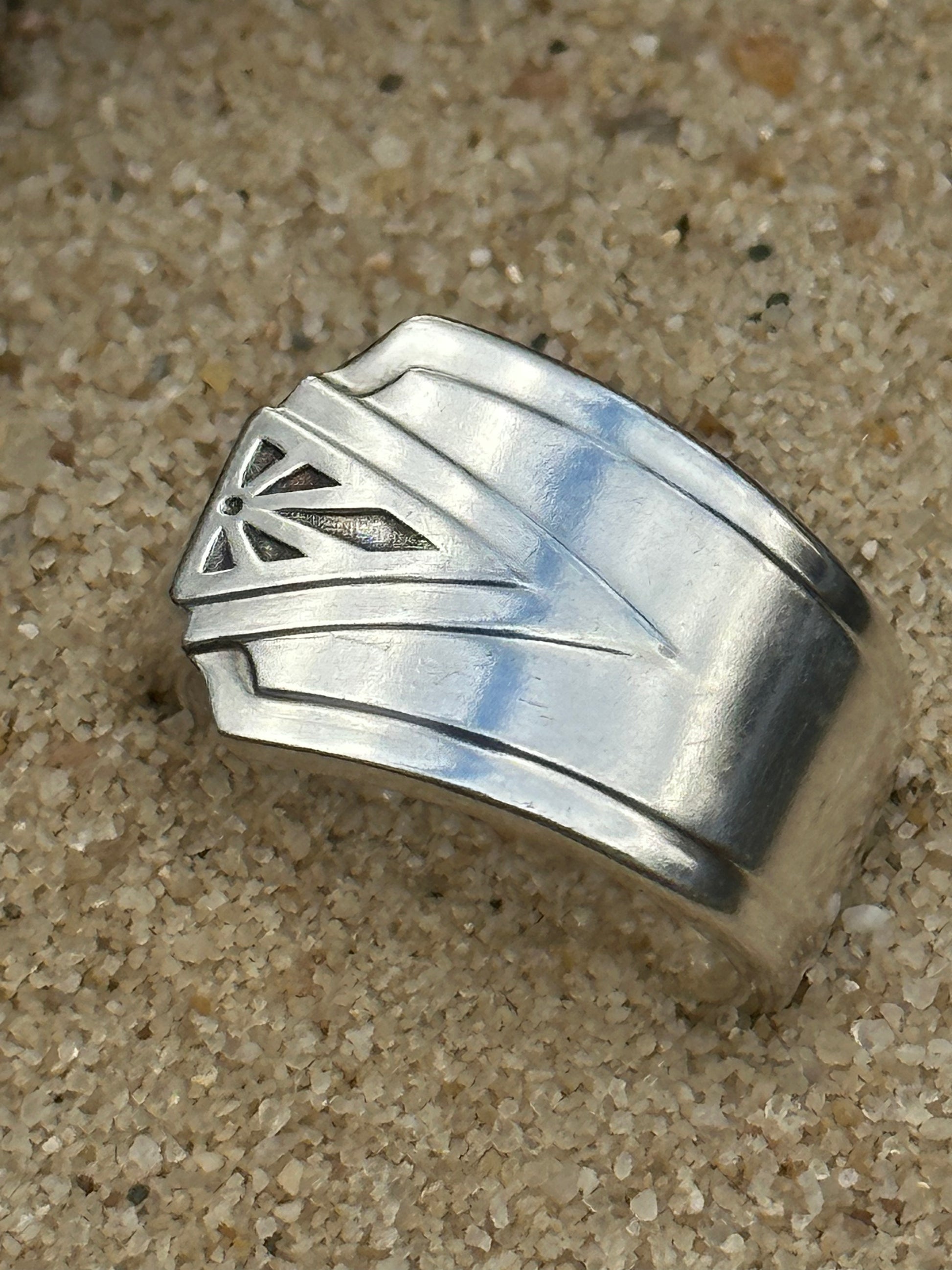 Silver plated spoon ring handcrafted from the Deauville pattern by Oneida Silver, introduced in 1929.