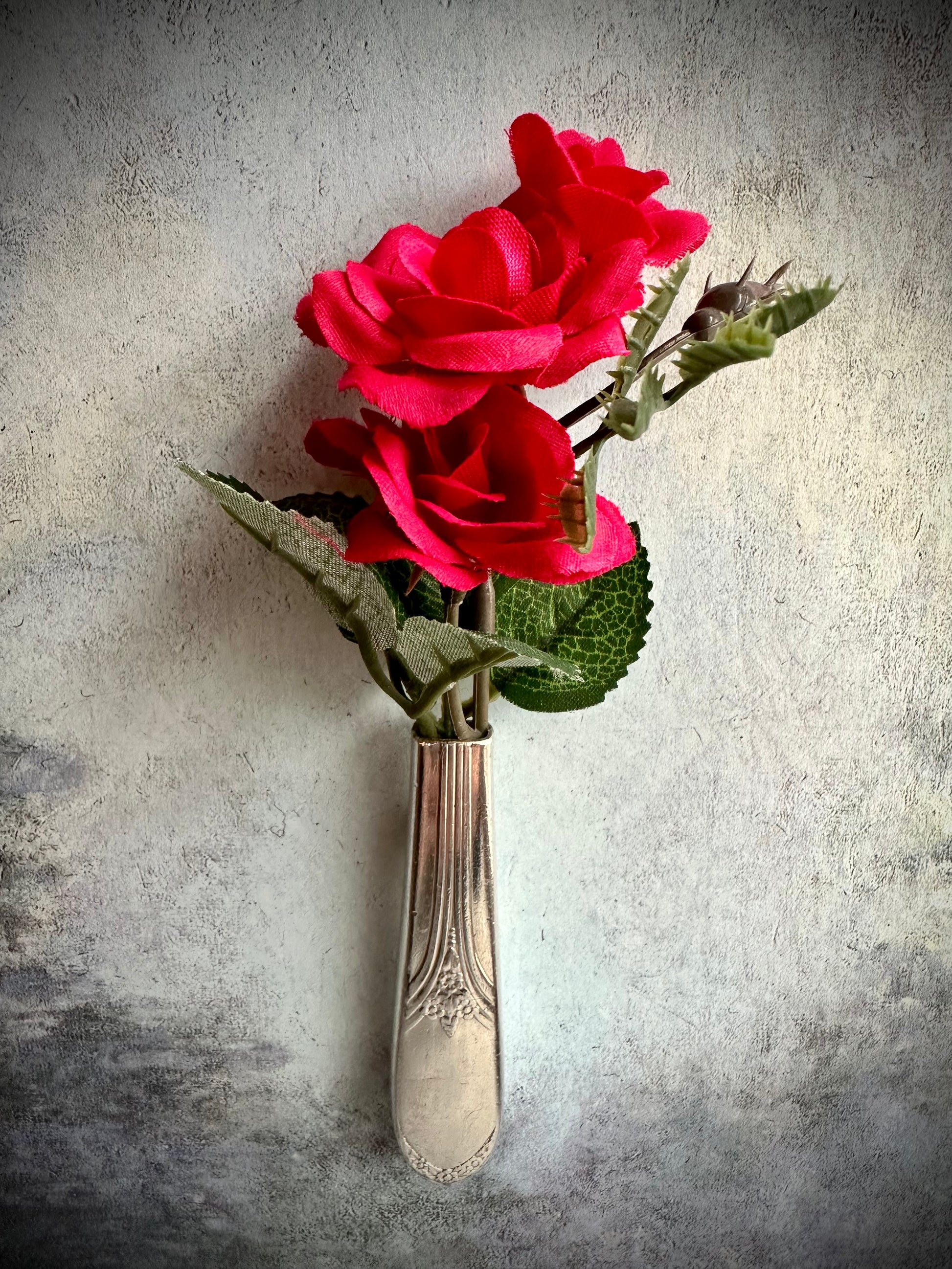 Elevate your kitchen decor with our Vintage Silver-Plated Knife Magnetic Bud Vase. A stunning fusion of vintage charm and modern functionality, this hand-crafted piece features a 1938 MaryLou - Devonshire pattern knife handle and a powerful neodymium magnet, turning it into a unique and elegant refrigerator magnet. Perfect for displaying your favorite flowers or herbs in style.