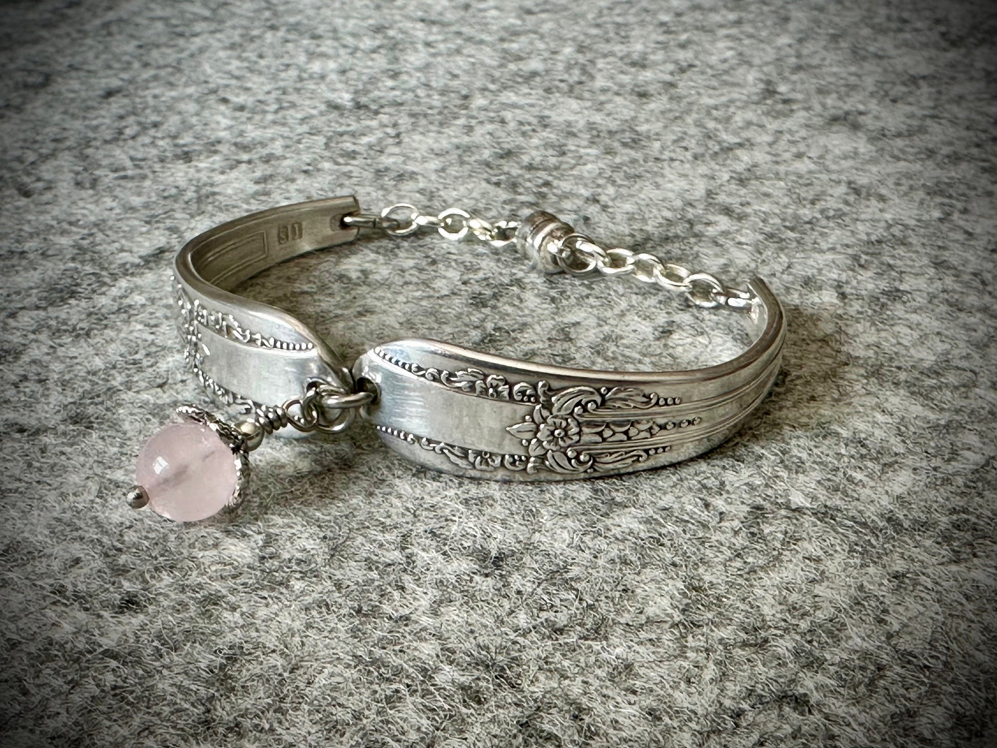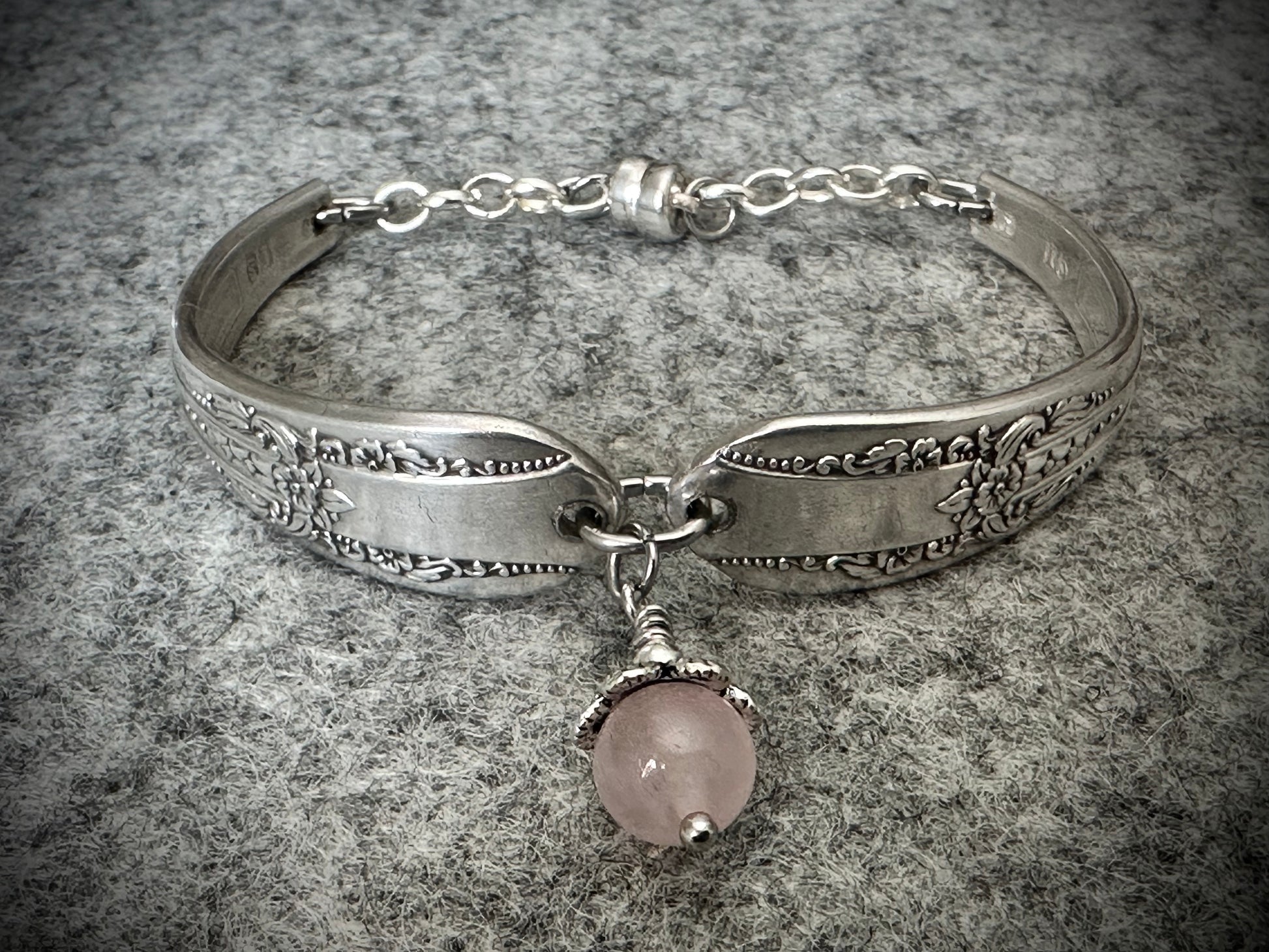This bracelet was hand-crafted using the handles from two pieces of Reflection patterned silverware made by International Silver beginning in 1939. It has an 8mm rose quartz bead charm in the center and a magnetic clasp. This would make a wonderful Mother's Day gift or just a unique piece of jewelry for yourself. Rose quartz is considered to be the stone of universal love, restoring trust and harmony in relationships. It helps provide comfort in times of grief and is thought to increase fertility and protect both mother and the unborn child from miscarriage.