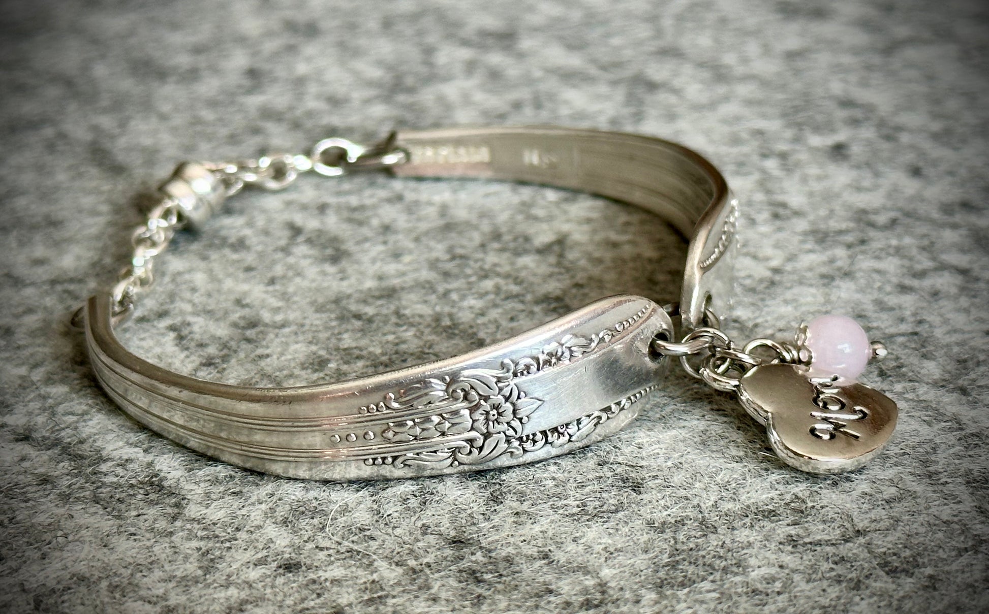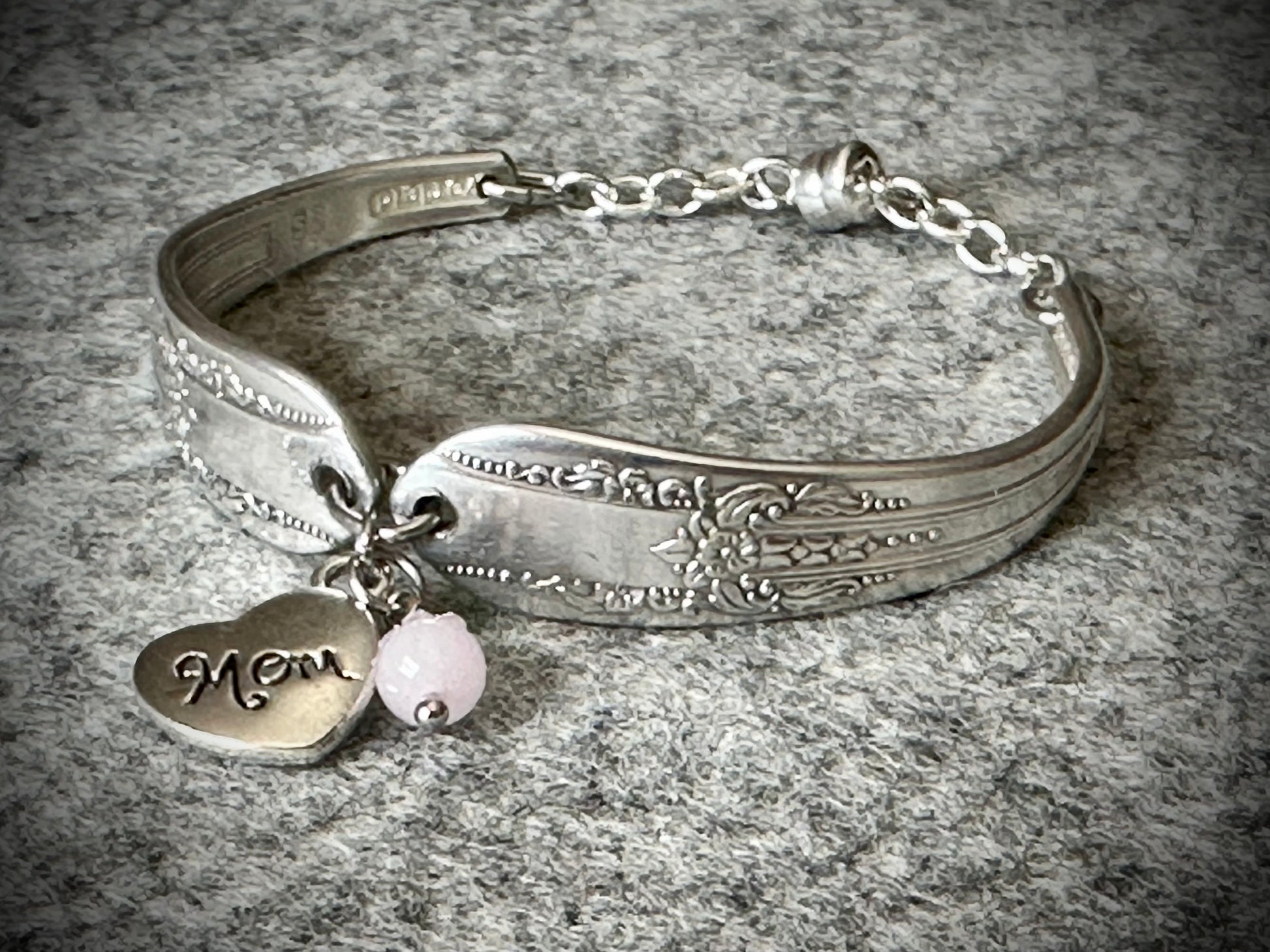 This bracelet was hand-crafted using the handles from two pieces of Reflection patterned silverware made by International Silver beginning in 1939. It has an 6mm rose quartz bead and a "Mom" heart charm in the center and a magnetic clasp. This would make a wonderful Mother's Day gift. Rose quartz is considered to be the stone of universal love, restoring trust and harmony in relationships. It is believed to help provide comfort in times of grief and to increase fertility and protect both mother and the unborn child from miscarriage.